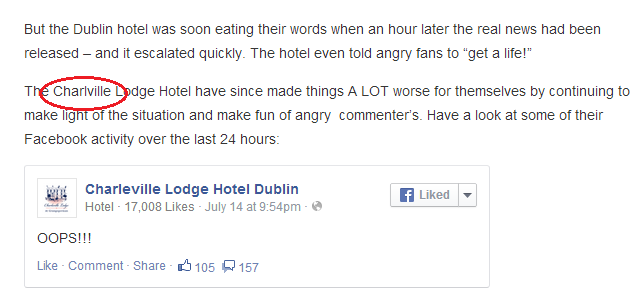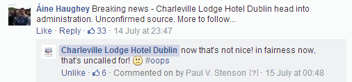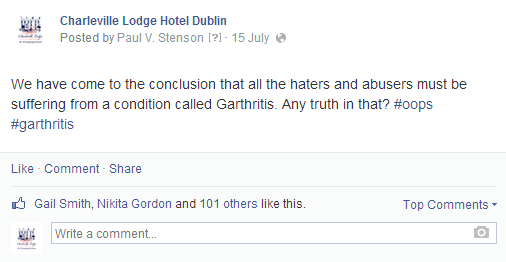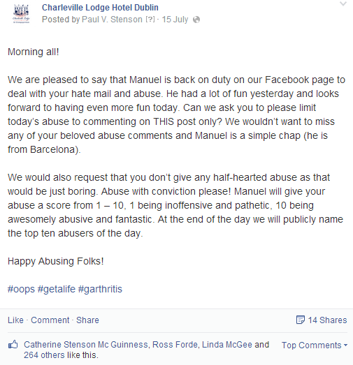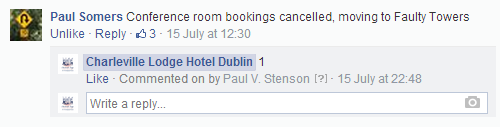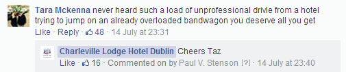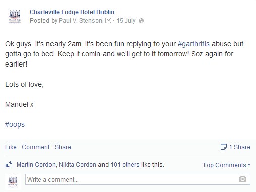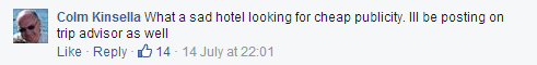 All of a sudden, calls started flooding in to the (poor unfortunate) receptionist on duty at the hotel. She was unaware of the devilment I had been up to on the page. So, when the first culchie (of many) rang asking what the story was, our receptionist replied along the lines of “I’m sorry I haven’t been posting anything on our page”. The angry culchie (let’s call her a cuntchie) went back to Facebook and posted “the hotel didn’t post anything, it must have been hacked”.