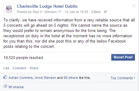 In a bid to curb the number of calls coming in to the poor receptionist, and in an effort to further prove to the world just how sure we were about the concerts, I put up yet another post on Facebook: