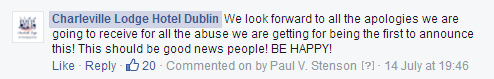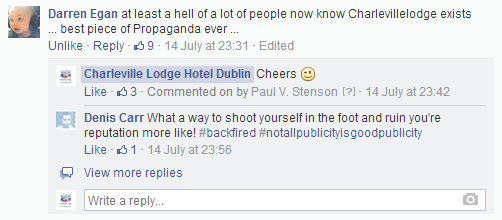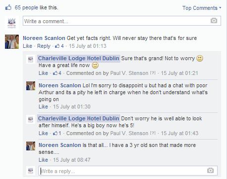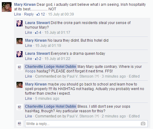 As much as I thought that now was an appropriate time to walk the dog, clean my windows (both sides), do some yoga exercises, bleed my boiler, comb my leg hair, pirouette in my new violet lycra tutu, I realised there was no escaping from the Charleville Lodge Hotel Dublin Facebook page. No matter how much procrastination I would do, I still had to face the music; I had to click back on the page.