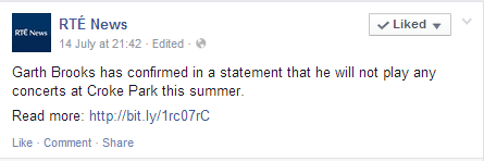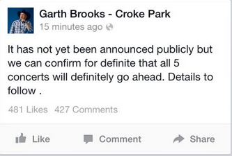 I then noticed that another Facebook page called Garth Brooks – Croke Park, which had far more fans than us, had posted a similar message to ours on their page. “Phew”, I said to myself. Looking more closely at the post, however, I noticed uncanny similarities between my wording and theirs. The sentence ‘it has not yet been announced publicly but we can confirm for definite that all 5 concerts will definitely go ahead’ was exactly the same as my sentence. Could they have simply copied and pasted from our page?