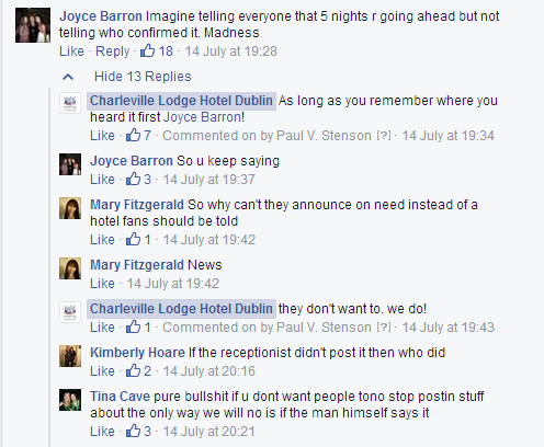 As a result of these articles on two prominent Irish websites, the destination of choice for most Garth Brooks loving cuntchies was the Charleville Lodge Hotel Facebook page. Our likes must have increased by at least a complete of hundred in the space of the hour. All good, wholesome, cuntchie likes by good, wholesome, cuntchie folk.