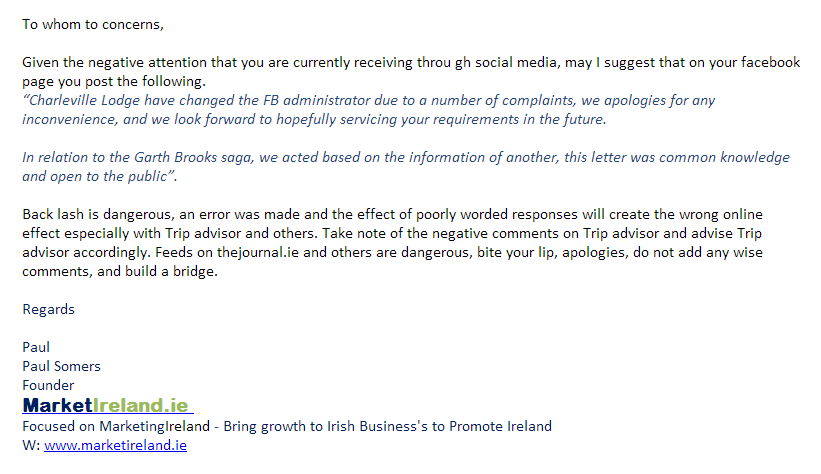 The Journal – http://www.thejournal.ie/charleville-lodge-hotel-apologises-for-garth-brooks-status-1571733-Jul2014/
