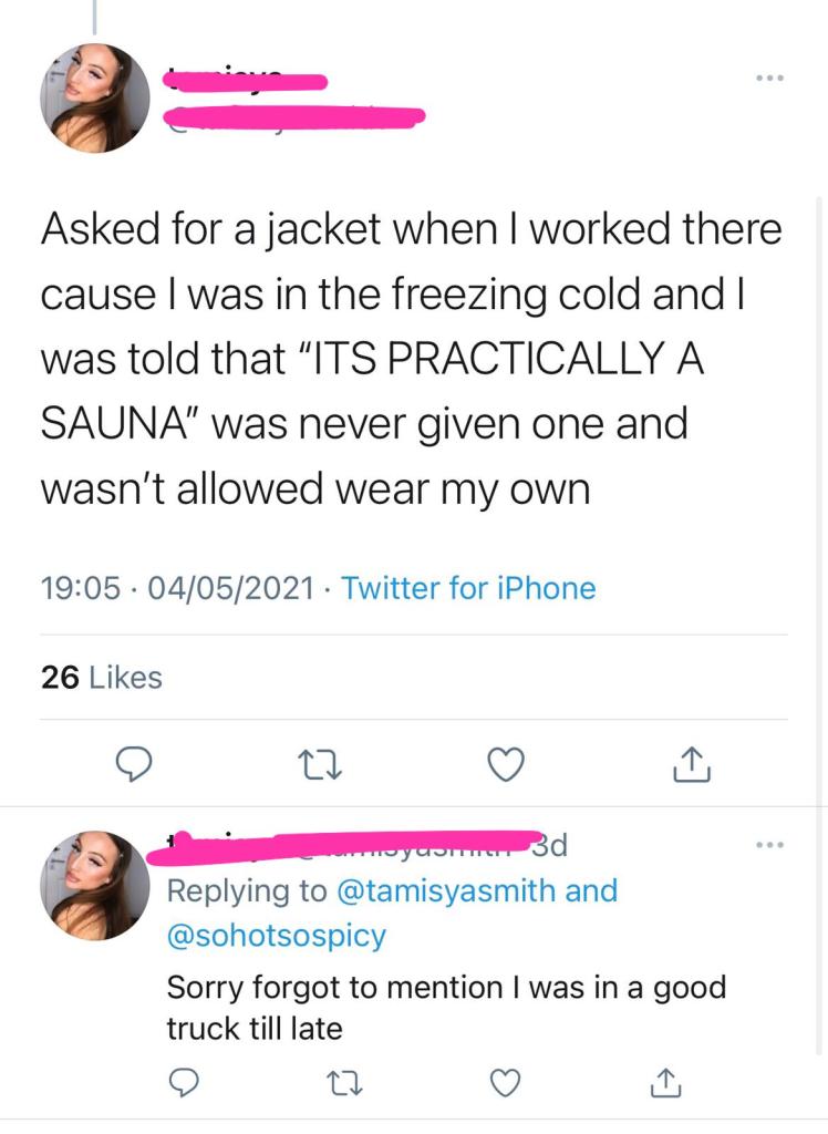 While I don’t want to reveal this girl’s identity, again to protect her, let’s just call her Mrs D.J. (I’ve heard of Mr D.J., but never Mrs, so this looks like a good opportunity to christen her with that name). She is a D.J. and while the more facetious folk amongst you might say she was looking for attention as a way to boost her D.J. career, I will just say she was going through a very confused part of her life. In a tweet, she mentions that Paul Stenson didn’t allow her to wear her own jacket while she was working in a good truck (typo for food truck I’d imagine).
