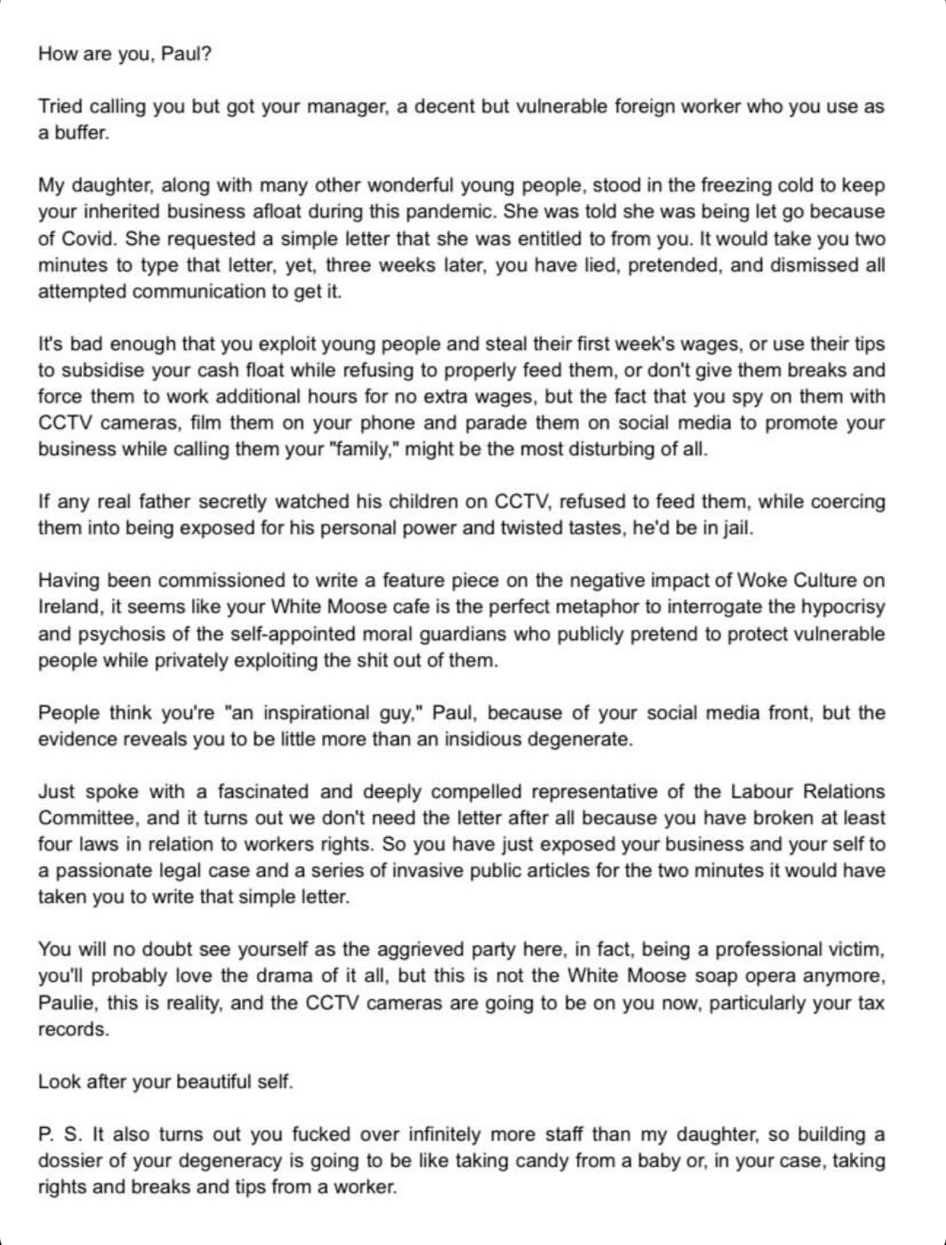 Firstly, thank you for all your coverage of my brand over the past week. It does mean a lot. However, while you and your band of merry mob have been most productive in your publicising of the Mighty Moose, in future I would urge you to get the full picture before you share a one-sided story online. Remember, while you do despise me and you might want to ‘cancel’ the cafe, just bear in mind that there are several people in gainful employment in my cafe. They provide for their families. They put bread and milk on the table by working in our business.