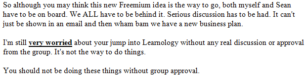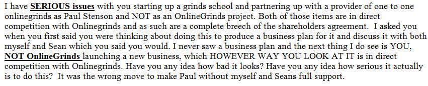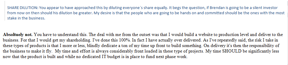 If they say they will develop and design a website from scratch, with all the capability of broadcasting live and interactive online grinds, this does not mean they should simply purchase third party plugins and insert them into their very basic site structure. That’s cheating. All the code should be indigenous. Otherwise the company will have very little IP, which means in the event of sale, it will have very little value. Besides, a blind ape with no arms could develop a website if it was simply based on third party plugins and no indigenous code, and you wouldn’t have to give him any equity at all.