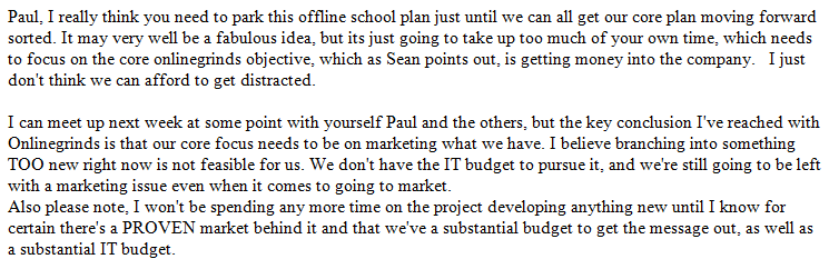 For some reason I envisaged BS to be a hoody-wearing, idea-generating, Mark Zuckerberg type who would rock in to me in the office at 7am saying “Paul I was up till 3am working on this new page, I’ve had this awesome new idea”. But no, BS didn’t come up with 1 idea for OnlineGrinds.ie. That was up to the rest of the team. And whenever we brought up an idea, and asked him to implement it, he would reply with 2 words, “Phase 2”.
