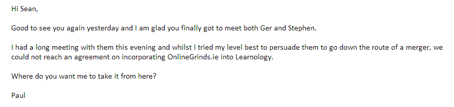 (f) Investment. One particular man who read the blog wants to have coffee with me about potentially getting Learnology back up and running. He said it “was too much of a great brand to let go”. While seeking investment funds was never an intention of writing the blog, I am going to meet him; for the craic, if nothing else (hi A. if you are reading this!). While this is not at the top of my priority list, it is exceedingly more probable than option (e).